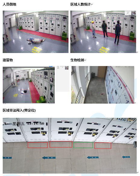 l 支持危險(xiǎn)區(qū)域非法闖入、警戒線、人員倒地、固定區(qū)域人數(shù)統(tǒng)計(jì)、帶點(diǎn)間隔人員入侵定位功能;